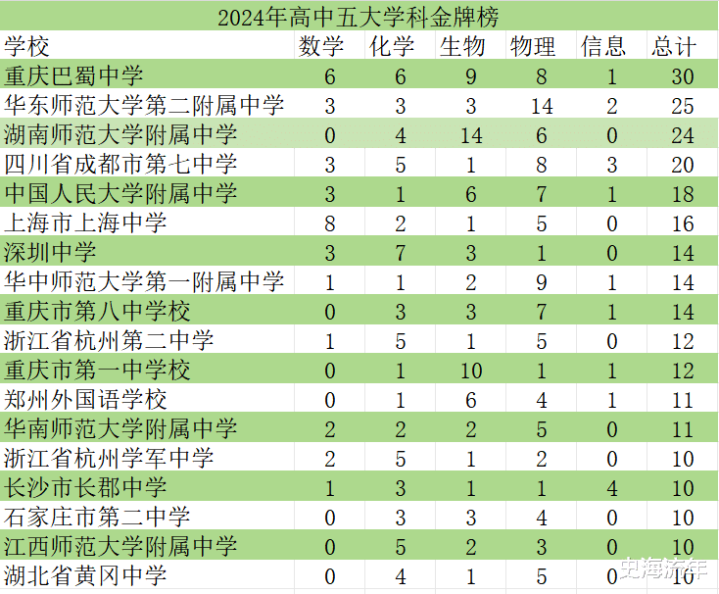 2024年全国高中数学、物理学、化学、生物学、信息学五大学科奥林匹克竞赛决赛,深圳中学共有19人夺得金牌,排名并列全国第七位,金牌数比2025年的14枚,增加了5枚。