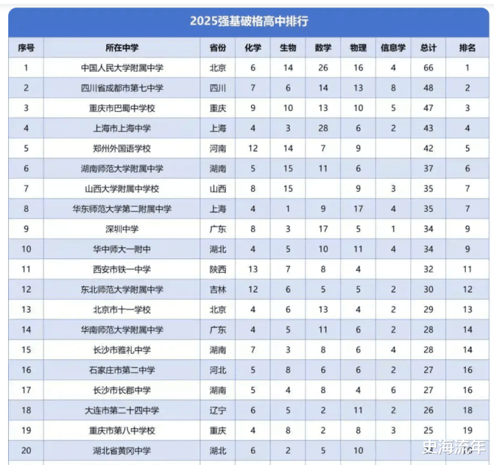 2025年高考深圳中学在清华北大“强基计划”破格人数上,也有新的突破,共有34人入选,排名全国第九位。其中数学17人,物理学共有5人,化学共有8人,生物学共有3人,信息学共有1人。最终共有18人被清华大学“强基计划”录取,其中,北京大学录取了8人,清华大学录取了18人。