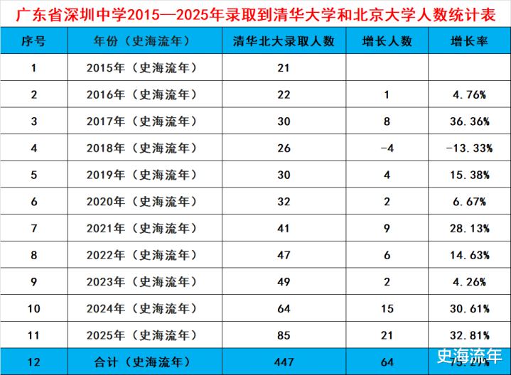 2025年,深圳中学在2024年大幅度增长的情况下,再次实现突破,共有85人被清华大学和北京大学录取,增加了21人,增长率达到了32.81%。录取清华大学和北京大学的总人数,在全国排名第八位,比2024年有了新的提高。