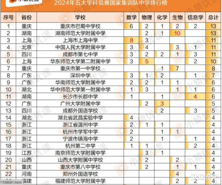 深圳中学共有7人进入国家集训队,其中数学3人,物理1人,化学2人,信息学有1人,总人数排名全国第八位。